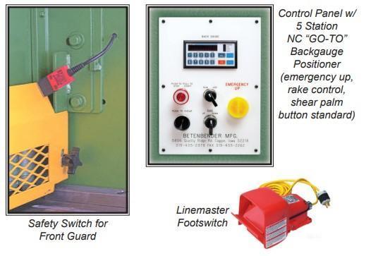 208-230/460v 3 phase • 36” Power Backgauge with LED Readout Inch / Metric • 4’ Squaring Arm with Inlaid Scale • All Hydraulic Fluids Included • All Steel Construction • American Made Hoses and Fittings • American Made Motor and Valves • Disconnect Switch • Hour Meter • Hydraulic Pressure: 2250 psi • Hydraulic Self-Compensating Holddown Bar Assembly • Light Beam Gauge (Shadow Line) • Linemaster Foot Switch • Manual Rapid Blade Gap Adjustment (3/8” and Larger) • Manual Swingup Backgauge • NEMA Electrics • Power Adjust Variable Rake • Safety Switch for Front Guard • Single Piece Top and Bottom, Shock Resistant Knives with Four Cutting Edges